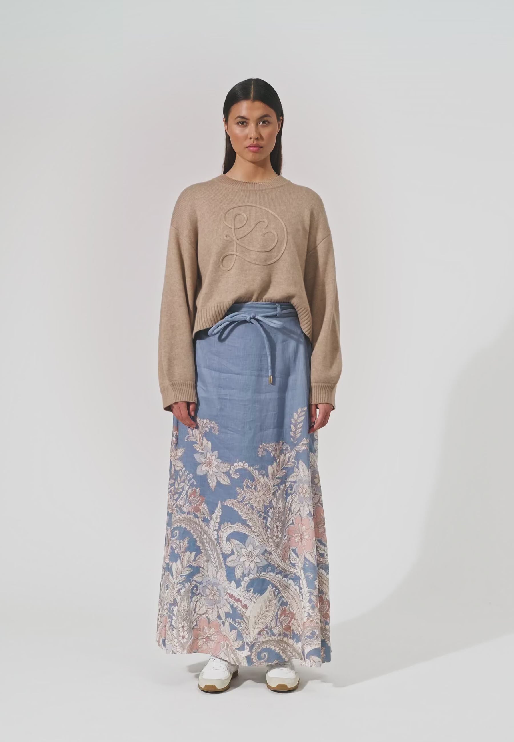 Lavorato in una miscela di viscosa, lana, cotone e cashmere in una ricca tonalità caramello, questo maglione è caldo e raffinato. Presenta una linea ampia e cropped con coste profonde, maniche lunghe e un logo ricamato tono su tono sul davanti.